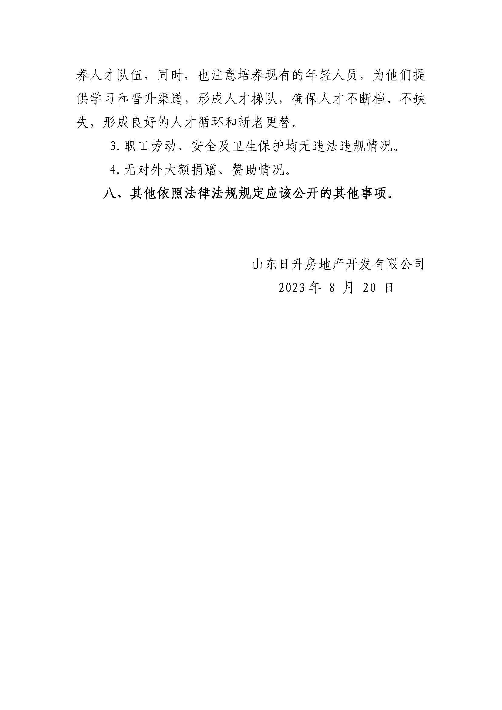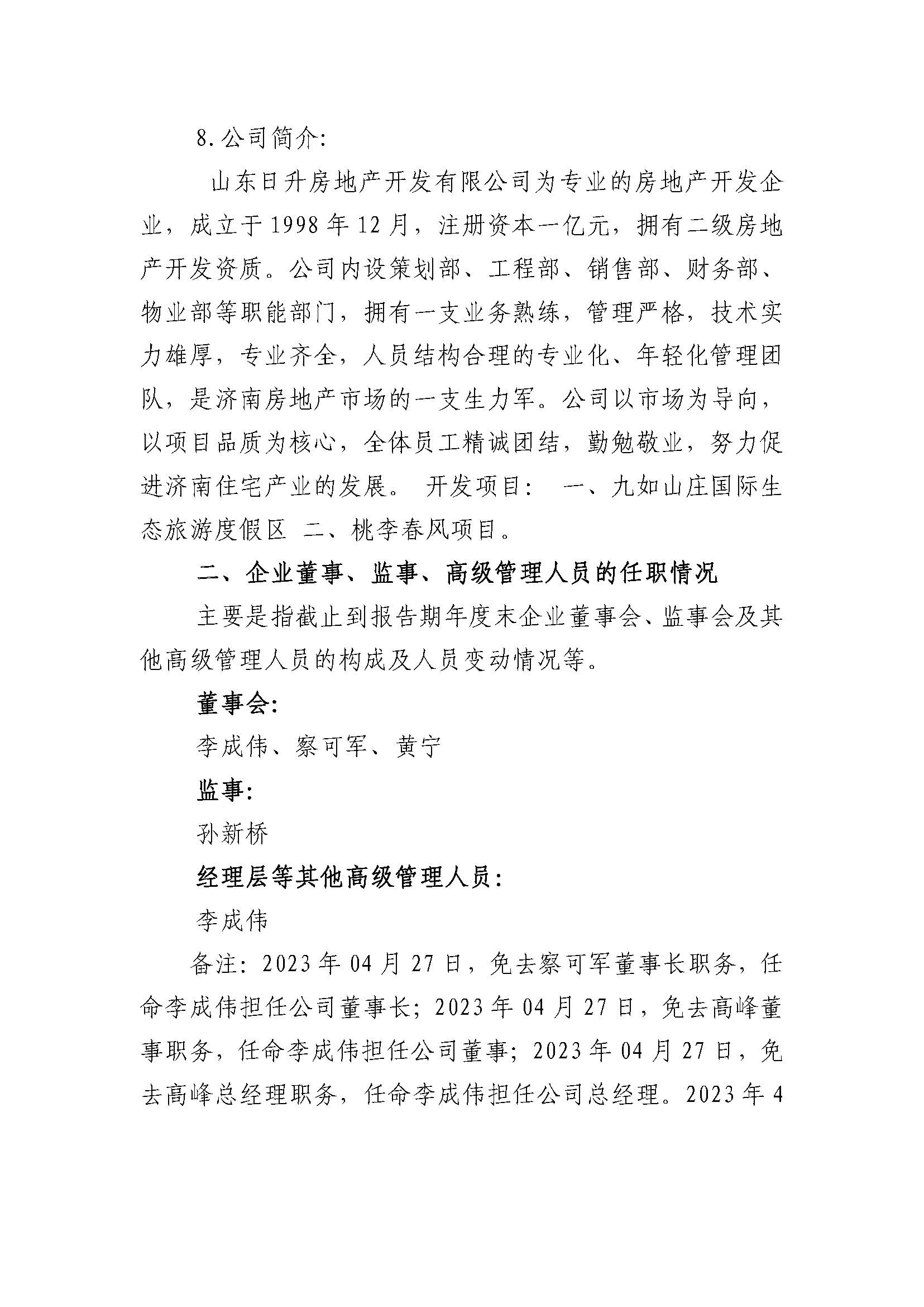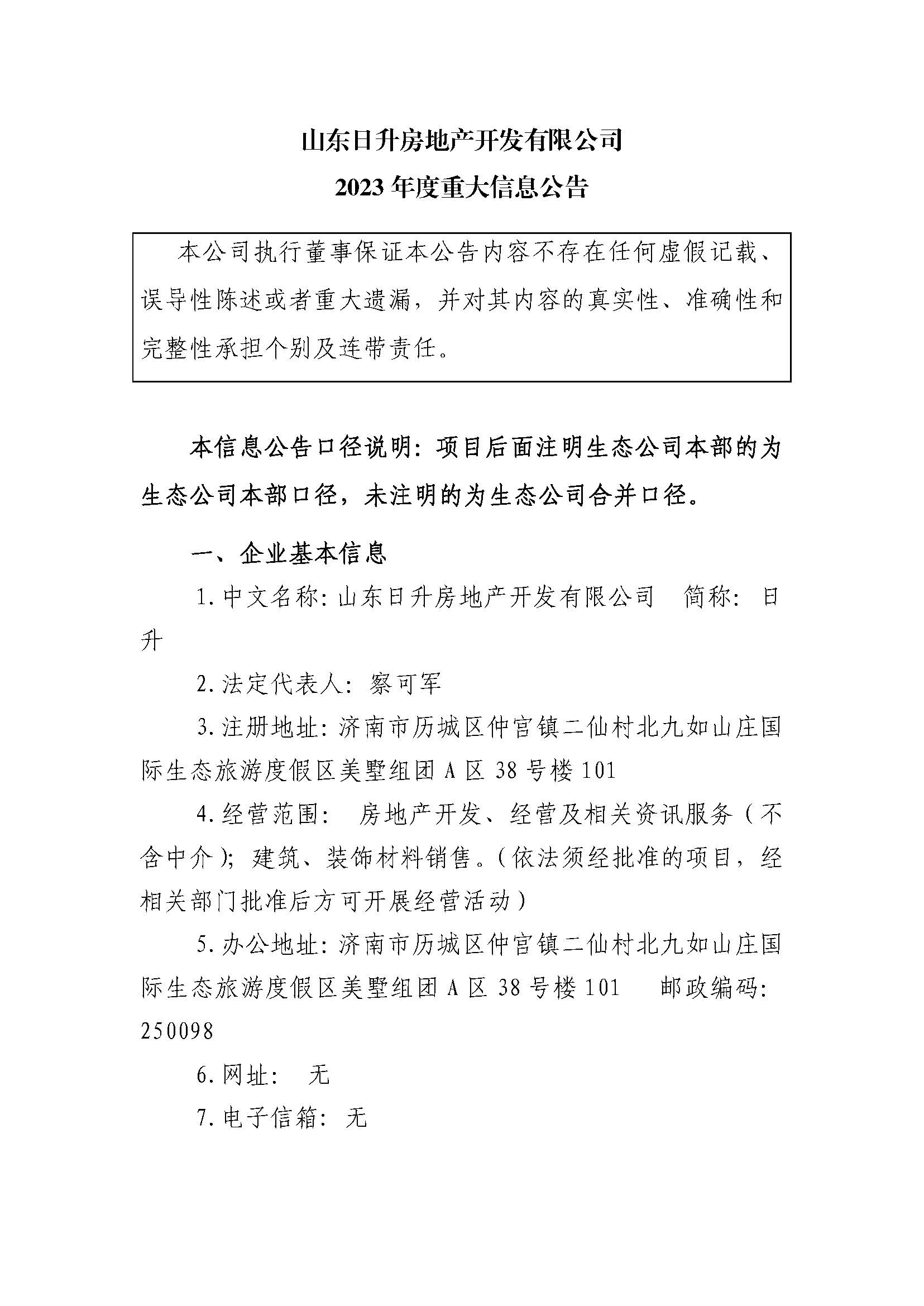 山东日升房地产开发有限公司2023年度重大信息公告