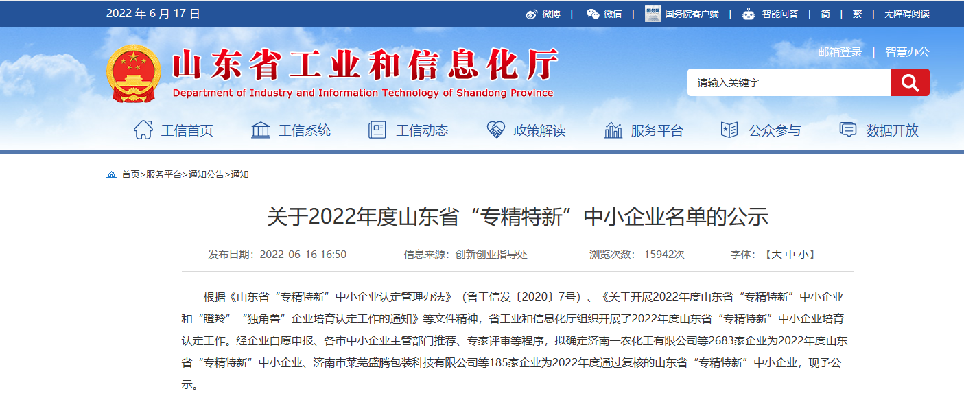 近日,山东环保产业研究院有限公司权属公司水发(山东)检验检测研究院有限公司成功通过2022年度山东省“专精特新”企业认定,获得了市级省级双认定。